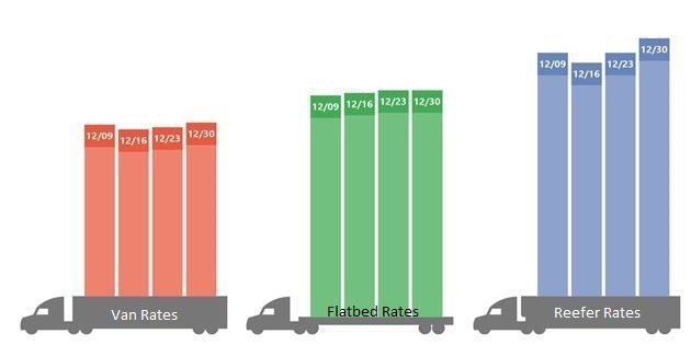 As of last week, van ratio hits an all-time high. There was urgency to move freight before the end of the year, but the combination of frigid weather and tight capacity due to both the holiday and the recently implemented ELD mandate meant that it cost more to move those loads last week. Load-to-truck ratios surged, setting a new all-time record-high of 12.2 loads per truck for vans. Rates reached historic highs (see graph below):