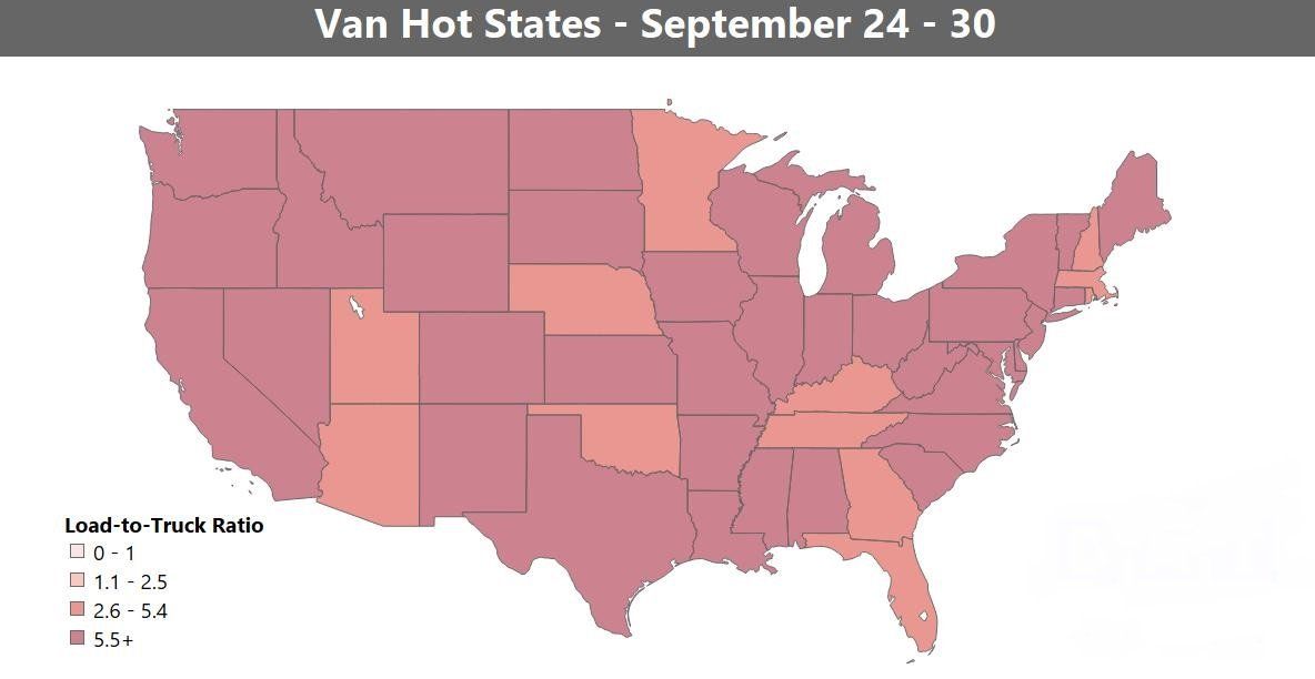 Meantime, rates and volumes are starting to come back down to normal in the Southeast, but supply chains throughout the rest of the country are still feeling the ripple effects, as evidenced by all the dark red in the Hot States Map below.