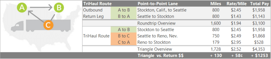 The extra stop adds about 130 miles, not including deadhead, but it can boost your revenue by more than $1,200. That gives you an average of $2.52 per loaded mile for the TriHaul, instead of $1.94 for the roundtrip.